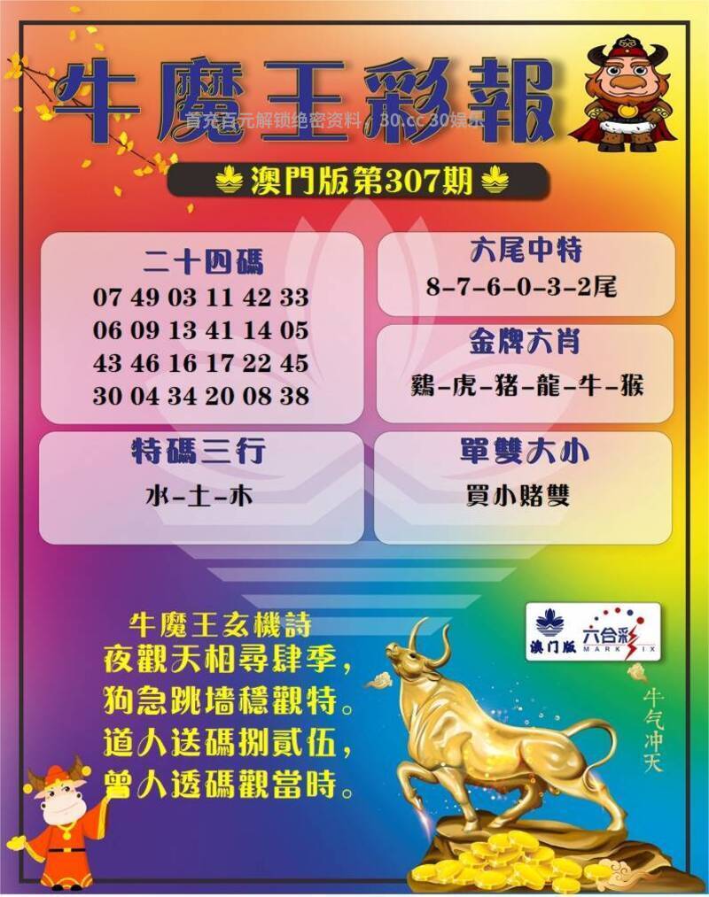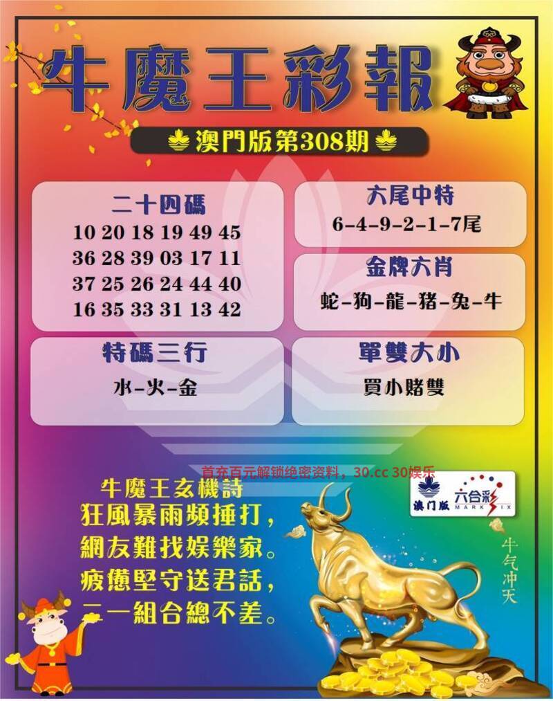 306期:【绝杀三肖】〖马虎猪〗开:牛17中